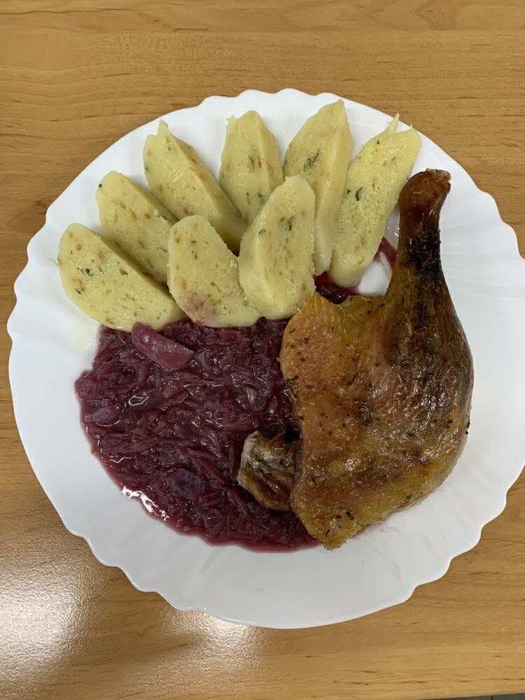 Dnešní ranní cesta do školky byla přece jen trochu jiná, než každý den.. Před školkou se objevily sněžné stopy! A komu patřily? To už k nám na bílém koni přijel svatý Martin. Děti ho šly přivítat na náměstí, kde se objevil přesně v 11:11 hodin. Venku byla pořádná zima, naštěstí nás ve školce čekal na zahřátí teplý oběd. Paní kuchařky připravily tradiční kachnu s červeným zelím. Byla to velká dobrota!